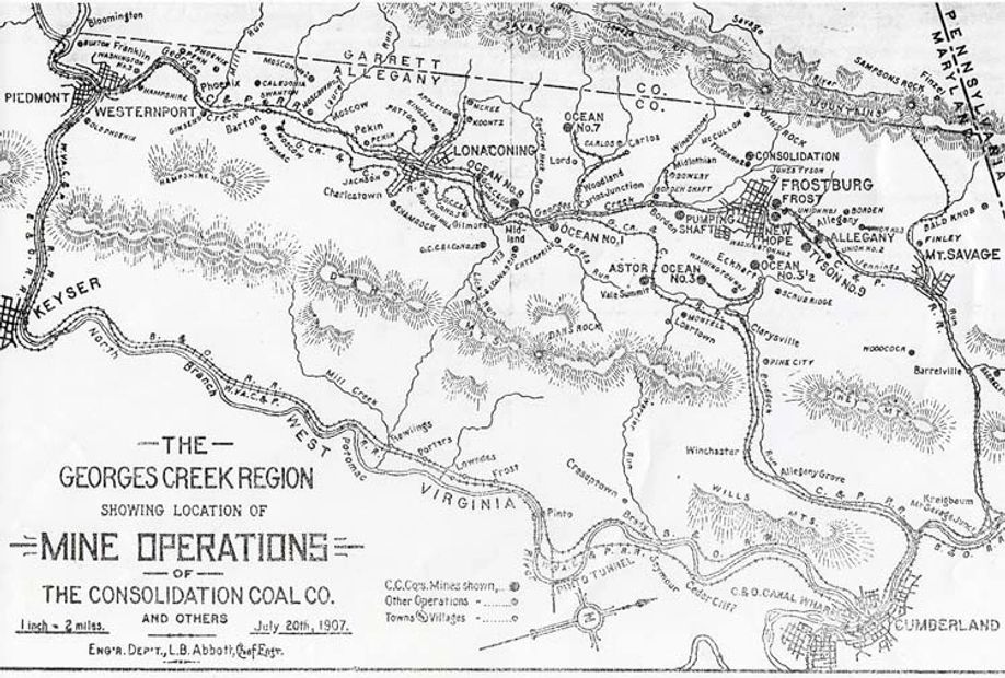 The Georges Creek RR was a short-lived line in antebellum western Maryland. Completed in 1853 from Westernport to Lonaconing (upper, left on the map), it came too late to save the financially troubled iron furnace at Lonaconing, In 1863, as coal production soared during the Civil War, it was absorbed into the Cumberland & Pennsyvlania RR, a shortline connecting the coal fields west and south of Cumberland, MD with the Baltimore & Ohio RR and C&O Canal.